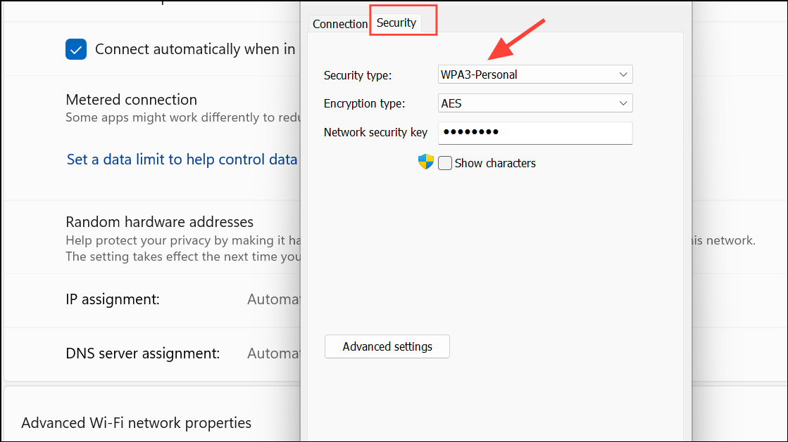 Step 5: Switch to the Security tab. Here, you’ll see both the Security type and Encryption type used by your current connection.