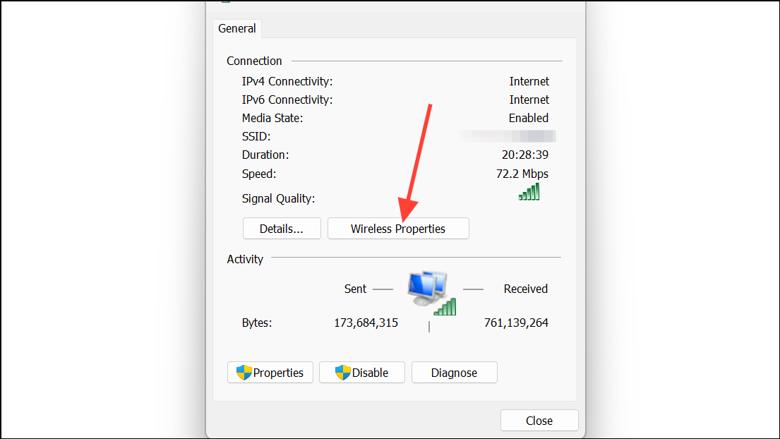 Step 4: In the WiFi Status window, select Wireless Properties.