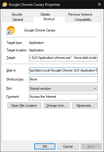- Launch Chrome Canary by using the shortcut you just edited on the Desktop. It should open with a Dark theme.
