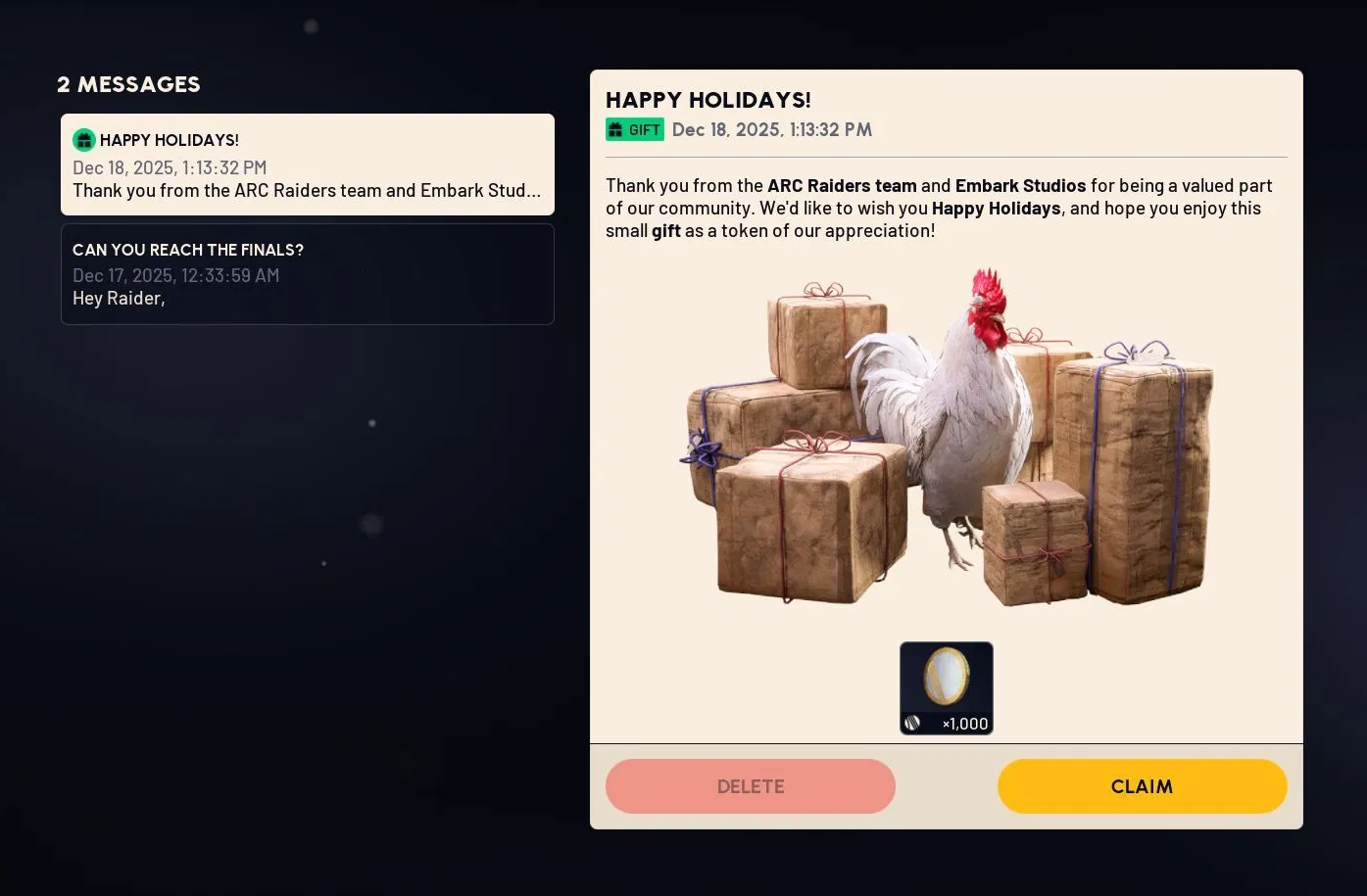 For the holiday event, Embark Studios is sending every eligible player 1,000 Raider Tokens via in-game mail. There is no gameplay requirement attached to the gift beyond logging in while the Cold Snap update and holiday celebration are active. The mail does not list an explicit expiry date, but it is clearly positioned as a seasonal reward, so waiting indefinitely is risky.