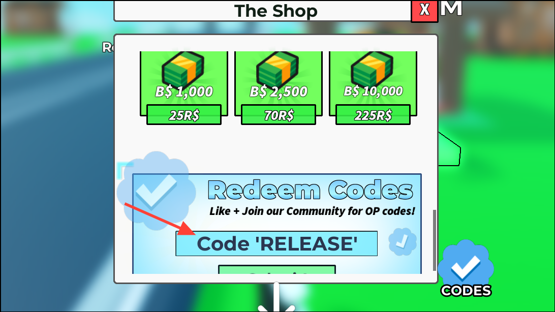 Step 3: Find the Codes section (either via a dedicated “Codes” button or by scrolling within the Shop).