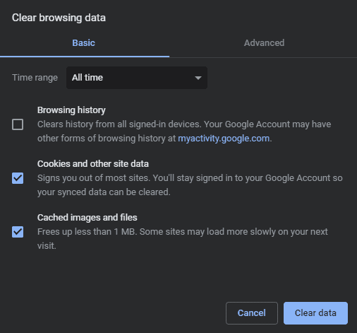 Make sure the checkboxes for cookies and cached files are ticked. If you don’t wish to delete browsing history, untick the checkbox for Browsing history. Hit the Clear data button.