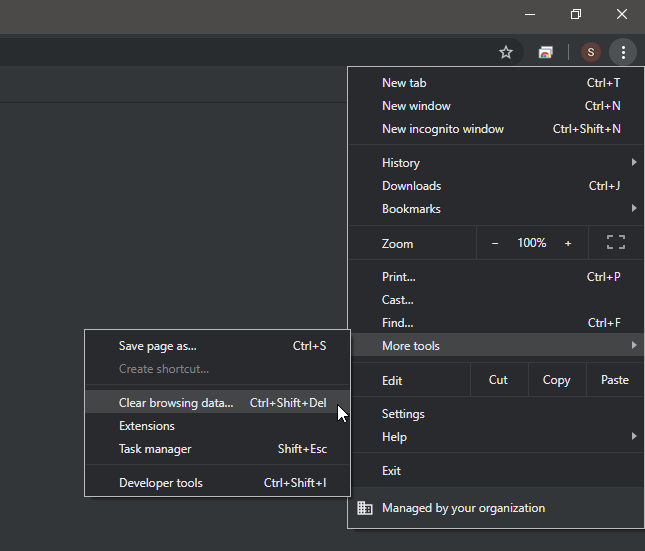 Click on the ⋮ menu button on the top-right corner of Chrome, then hover over More tools and select Clear browsing data from the list of options.