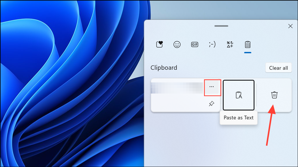 Step 3: To remove a specific item, locate it in the clipboard panel, click the three-dot menu (...) next to the entry, and select Delete. This allows for targeted removal without clearing the entire history.