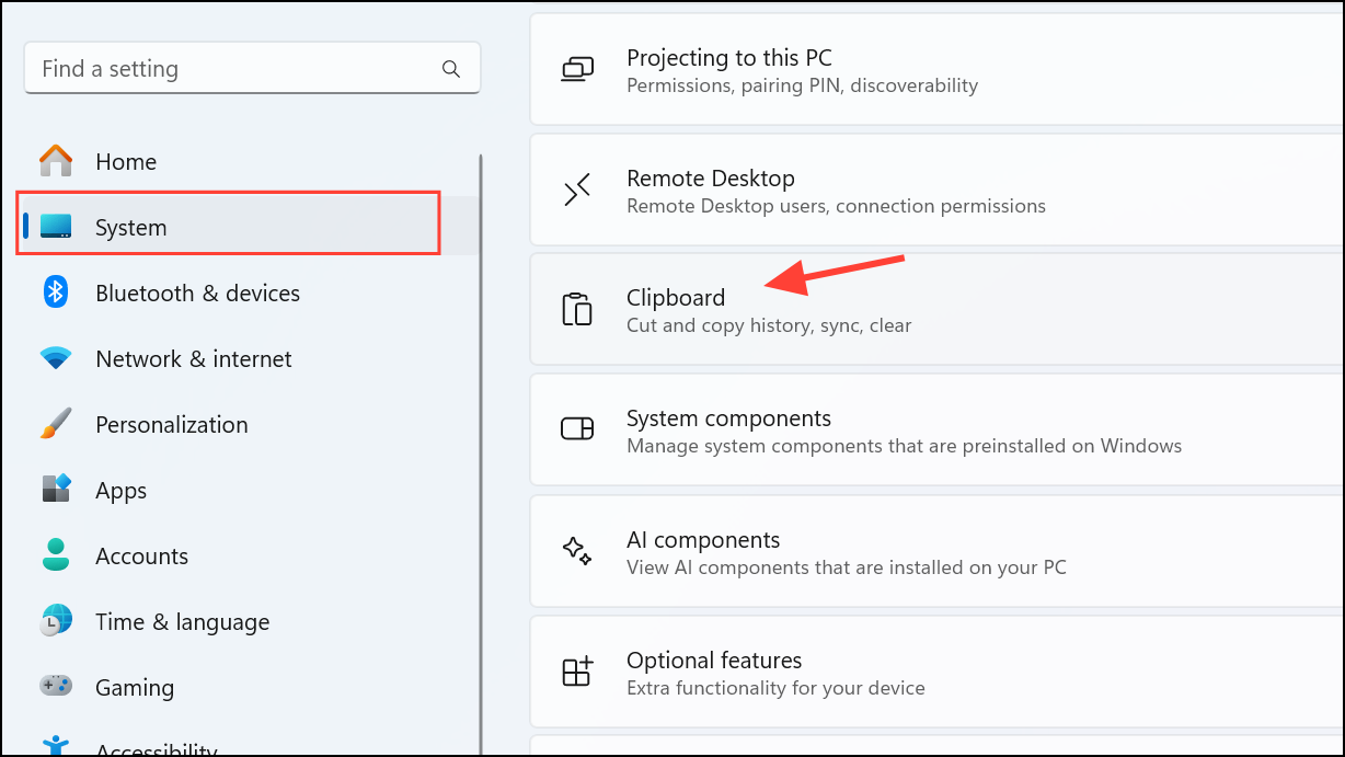 Step 2: Navigate to System in the left sidebar, then select Clipboard from the available options. This section manages all clipboard-related settings.
