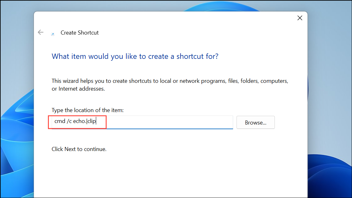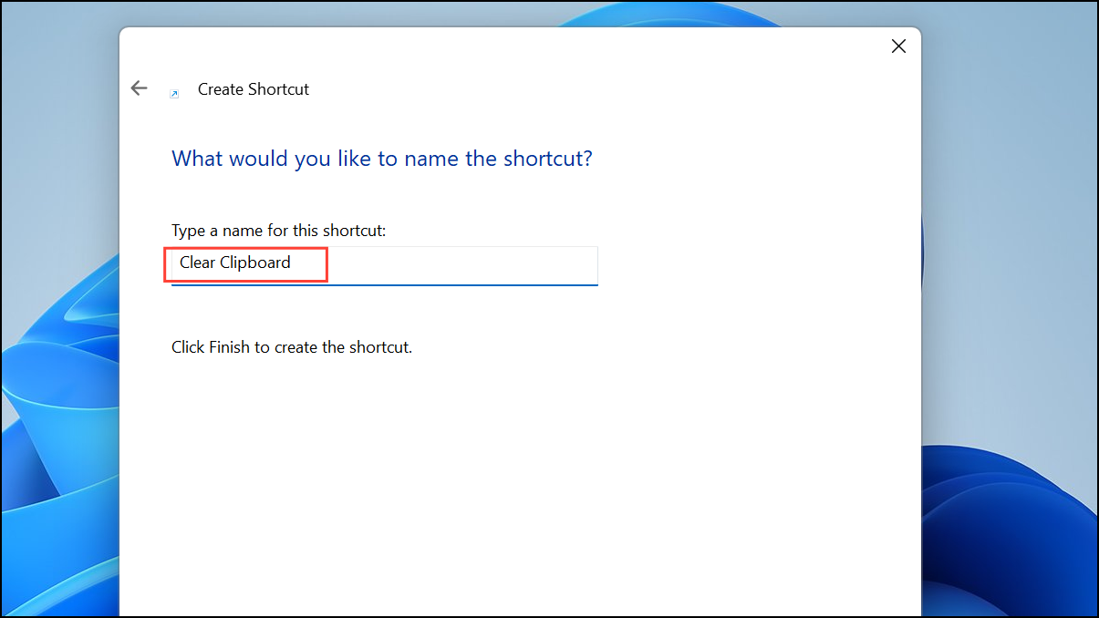 Click Next, name your shortcut (for example, "Clear Clipboard"), and click Finish. The shortcut now appears on your desktop.