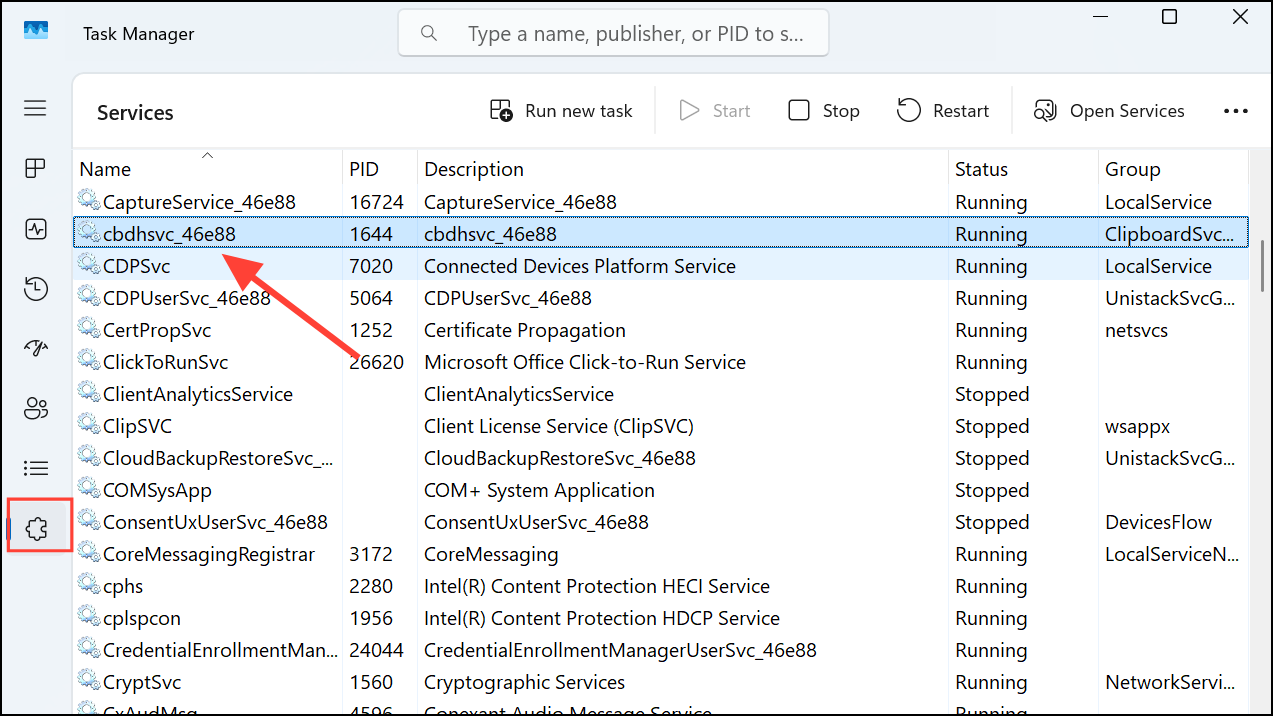 Step 2: Go to the Services tab. Locate the service named cbdhsvc_* (Clipboard User Service)—the asterisk indicates a unique identifier that may vary by system.