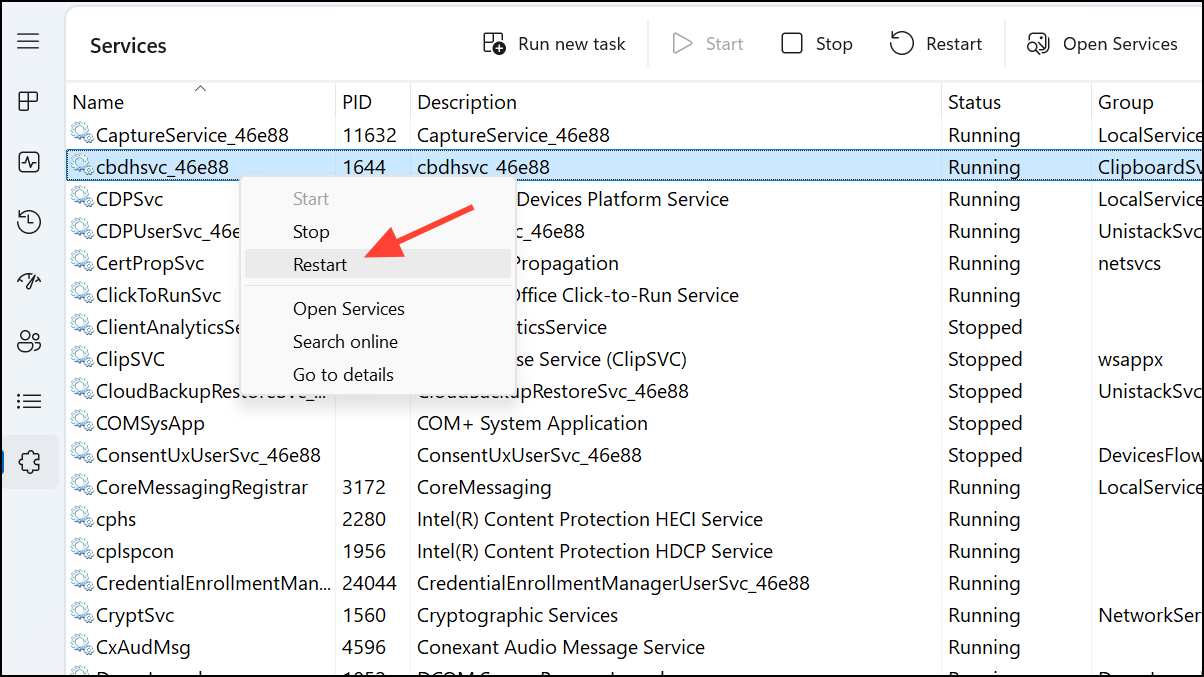 Step 3: Right-click the cbdhsvc_* service and choose Restart. This action restarts the clipboard service, resolving most clipboard-related glitches without rebooting your PC.