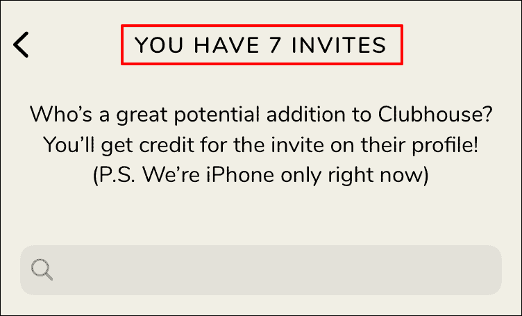 You will see the number of invites at the top. There is a search box right under it to search and invite your contacts to Clubhouse. Your contacts are also displayed under it, in case you want to select one rather than searching for it.