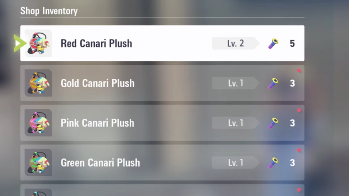 Each Plush grants a distinct buff, and you can repurchase the same Plush to raise its level for a stronger effect. Prices scale with each upgrade tier (e.g., 3, 5, then 8 screws, and increasing beyond that).
