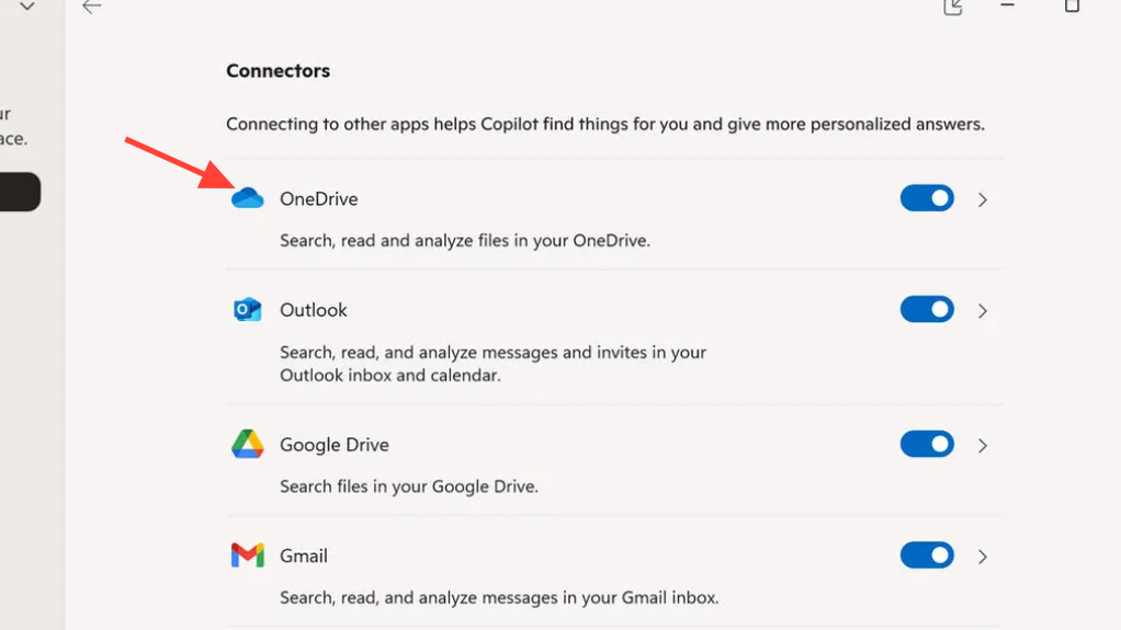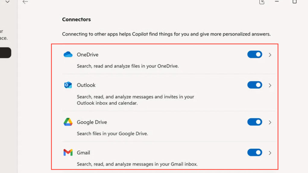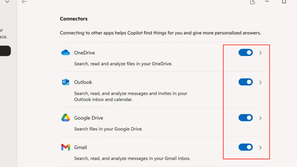 Step 2: Toggle off any service you no longer want Copilot to access. This immediately stops new searches from using that data source.