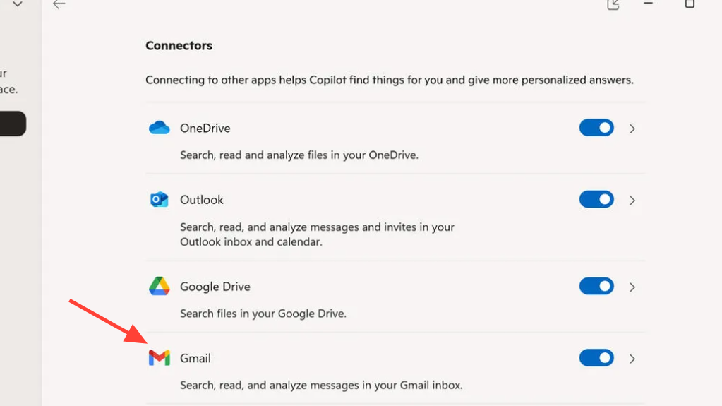 Step 5: Select Gmail to start linking your Google email. This grants Copilot permission to surface your messages using natural language queries.