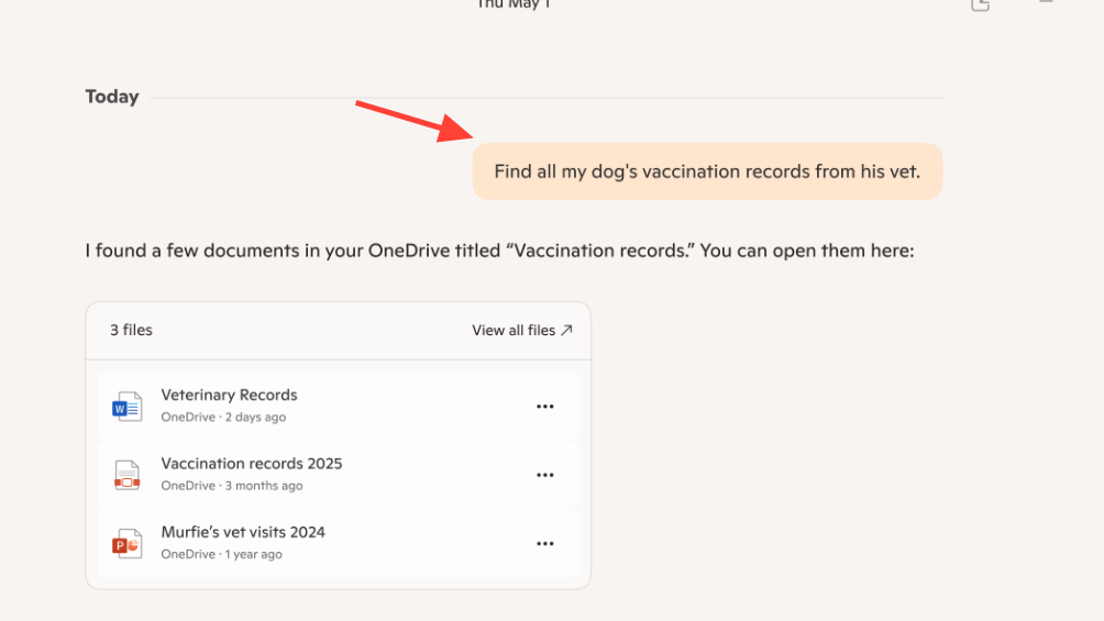 Step 1: Open Copilot and describe what you need. You can ask about people, files, or emails without specifying where they live.