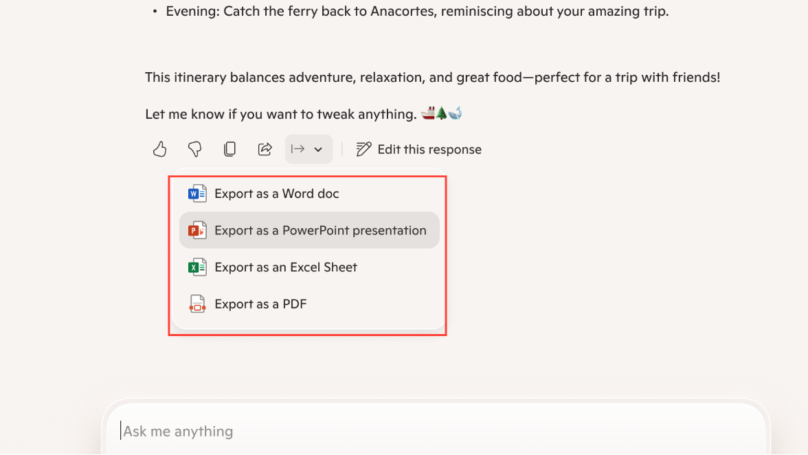 Step 3: Use the export button on longer replies. When a response is roughly 600 characters or more, an export option appears to send the content directly to Word, PowerPoint, Excel, or PDF.