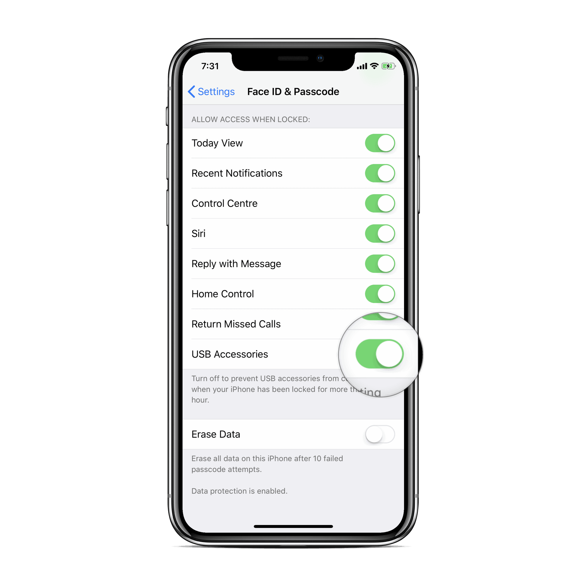 - Turn on the USB Accessories toggle to enable unrestricted USB access to your iPhone.