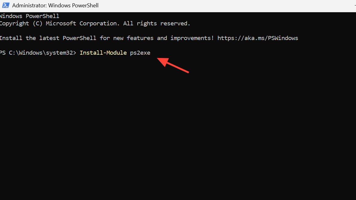 Once the module is installed, a simple command compiles a .ps1 file to an .exe. This is the quickest way to turn a script into a clickable application.