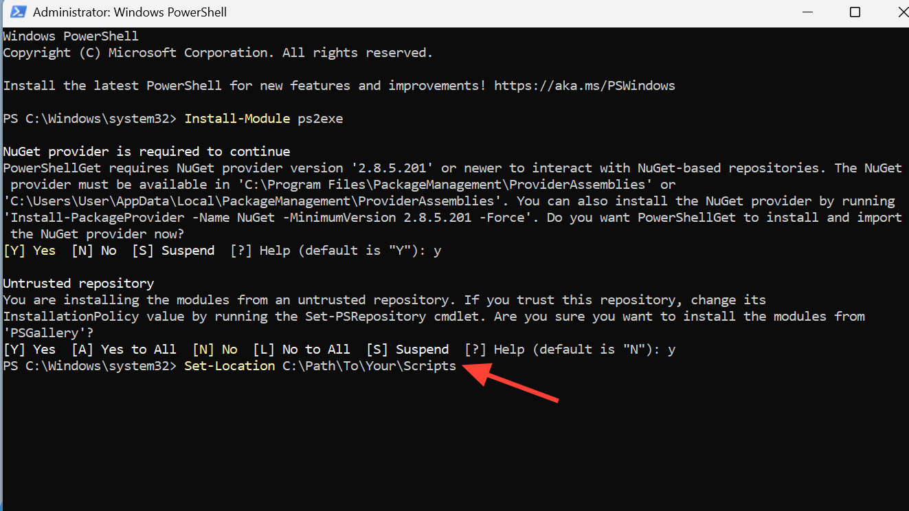 If you are prompted about an untrusted repository, type Y and press Enter to continue. PowerShell then downloads and installs PS2EXE from the gallery.