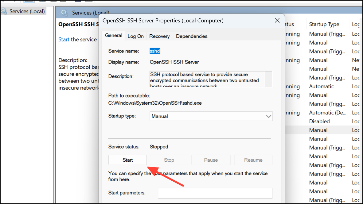 Step 2: Start the service by running services.msc and locating "OpenSSH SSH Server," then click the "Start" button.
