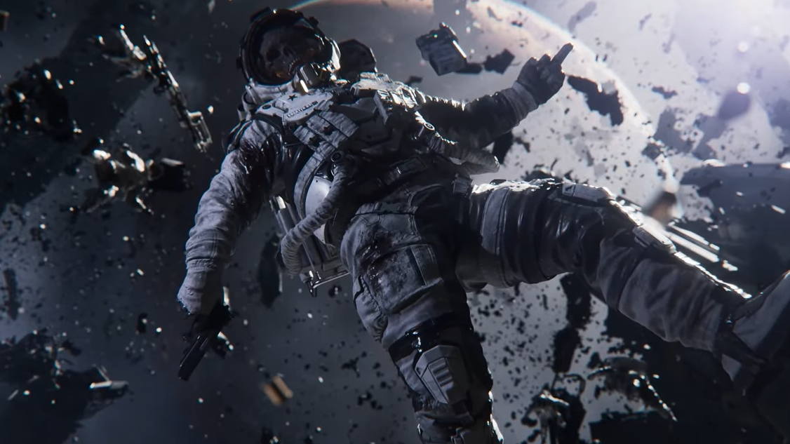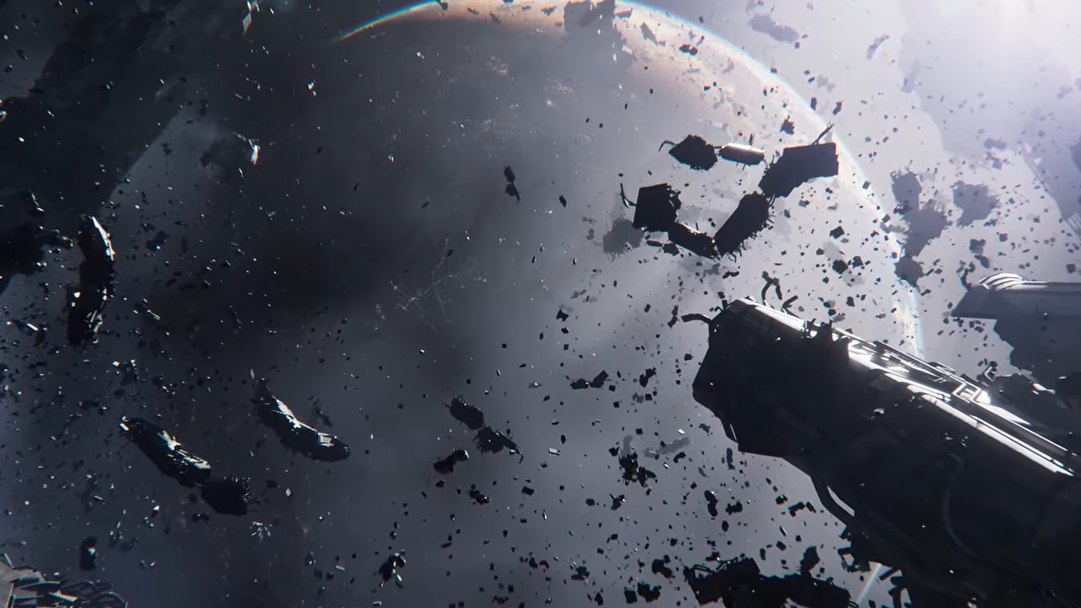 The reveal trailer opens from a soldier's perspective inside what appears to be the destroyed remnants of a city called Mariner City. The camera slowly pulls back to reveal a technologically advanced civilization on Mars, now reduced to rubble. The planet's orbit is littered with wrecked spacecraft and the bodies of cosmonauts drifting through the void. A surviving space station hangs in the distance, seemingly positioned to investigate whatever disaster befell the colony.