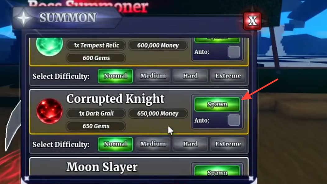 Step 2: Teleport to Boss Island and speak to the Boss Summoner NPC. Select the Corrupted Knight and confirm the summon using 1x Dark Grail, 650,000 Money, and 650 Gems.