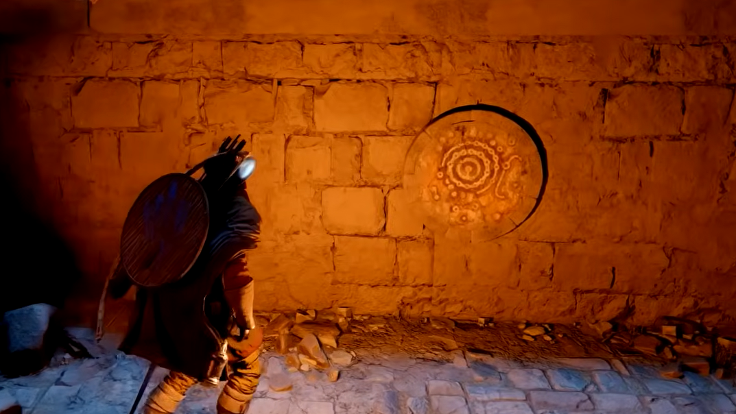 Each disc in the pit displays an illustrated image that can be rotated freely when you interact with it. The chamber's east and west walls both show the same hand-painted map of a section of Hernand, marked with three V-shaped symbols at specific locations. These marks correspond to three murals painted on cliff faces out in the open world, southeast of Anvil Hill and near the Halssius House of Healing.