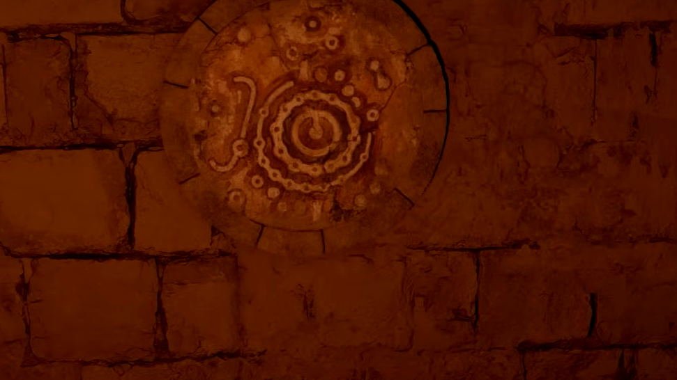 Step 1: Drop into the pit in the center of the Dragon's Stone Chamber and approach the first disc — the one showing a sun and moon. Rotate it until the sun and moon face north (toward the top of the disc as you look at it).