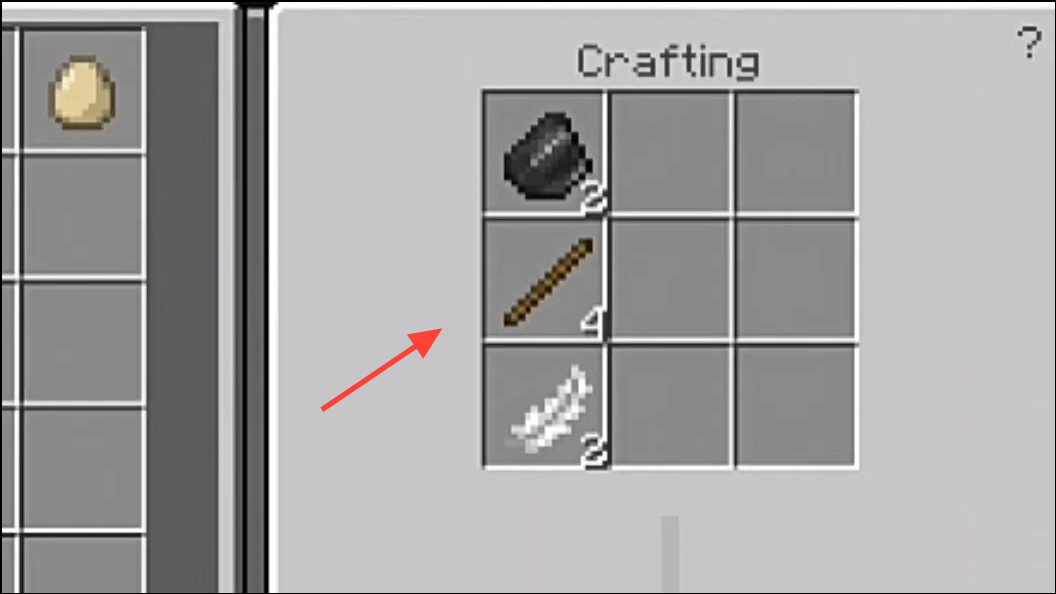Step 3: Place the items in a single vertical column: flint in the top-center slot, stick in the middle-center slot, feather in the bottom-center slot. Take the 4 arrows from the output.