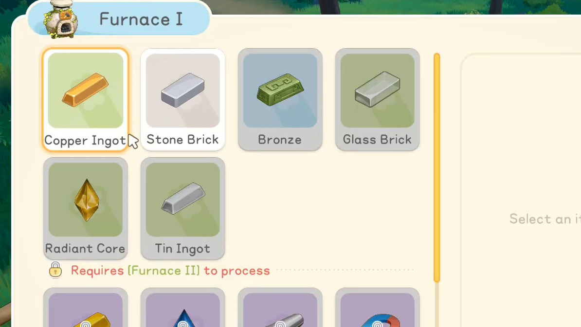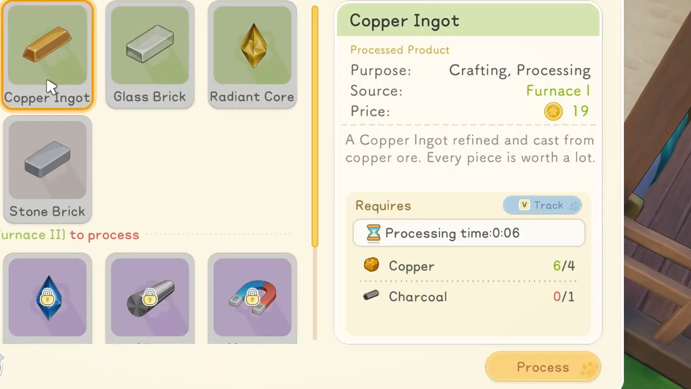 Step 2: Interact with the Furnace and select Copper Ingot from the recipe list. Each Ingot requires 4 Copper Ore and 1 Charcoal. Some versions of the recipe also require 22 Gold per Ingot, so keep Gold on hand if your game asks for it.