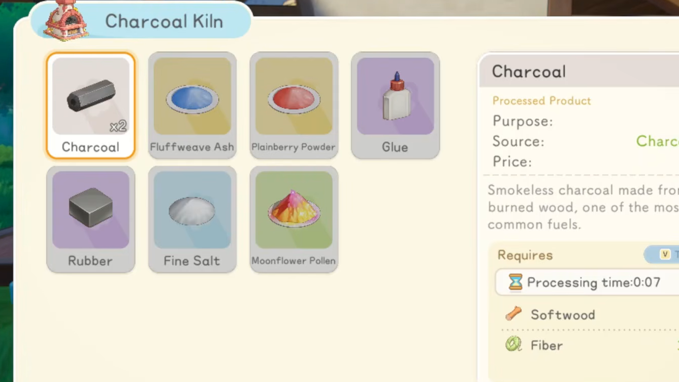 Once the Kiln is placed, interact with it and supply the following materials to create one piece of Charcoal:
