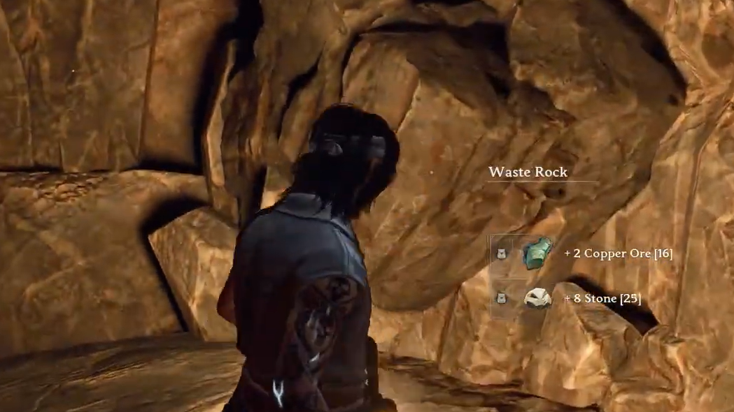Copper Ore deposits appear inside caves and rocky areas on the islands. When you get close enough, a pickaxe icon marks mineable spots on your map. Head inside a cave and look for stone walls with a bluish-white tint — strike them with your Stone Pickaxe, and Copper Ore will drop into your inventory.