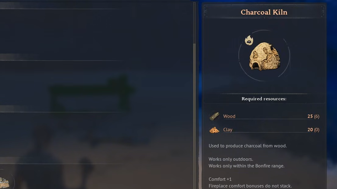 Smelting requires Charcoal as fuel, and Charcoal comes from a dedicated workstation called the Charcoal Kiln. The construction cost is relatively steep on Clay, so gather that material before you start building.