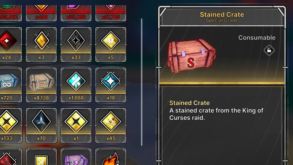 | Cursed Iron | 3 | Grade 3, Grade 2, Grade 1, Special Grade, Flame Crate, Volcanic Crate, Strengthened Crate I, Strengthened Crate II, and others |