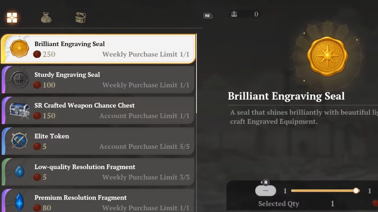 | Brilliant Engraving Seal | Bundle Shop, weekly overworld merchants, boss dungeon drops | Rare drop; weekly merchant stock is limited |