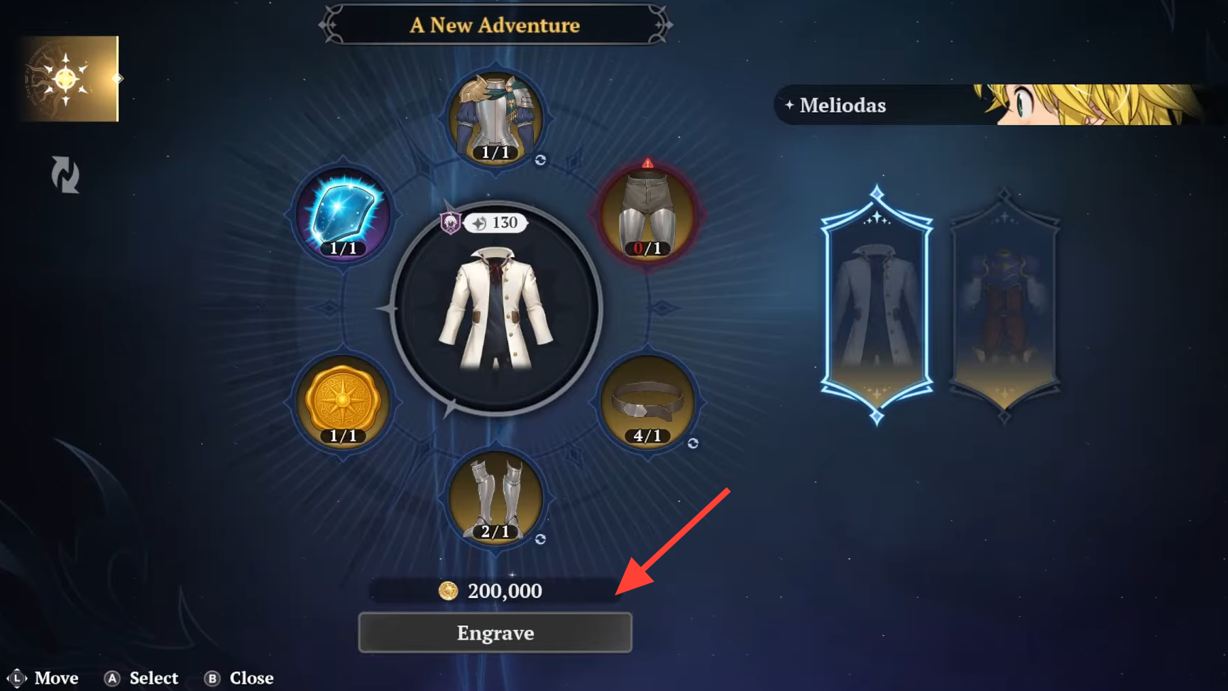 Step 2: Use the double-arrow icon in the upper-right corner to select the hero whose engraved gear you want to craft. The menu will display all available engraved pieces for that character.