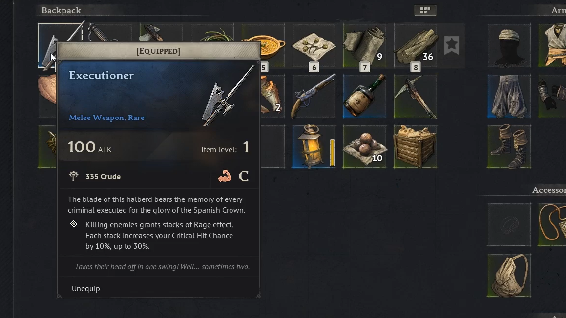 The Executioner is classified as a halberd-type melee weapon with 100 ATK and 335 Crude damage at its base Rare rarity. It scales with Strength (C scaling at Rare, B at Epic). Its signature passive grants stacks of the Rage effect every time you kill an enemy. Each Rage stack increases your Critical Hit Chance by 10%, stacking up to three times for a maximum 30% bonus. This makes the weapon particularly effective when you're fighting groups of enemies in quick succession, since each kill feeds the next with higher crit potential.