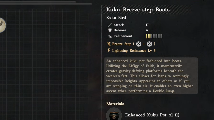 Once you have 1× Enhanced Kuku Pot, 1× Core of Faith, and 3× Electrical Components, travel to Grimnir's Kuku Shop (also referred to as the Mysterious Iron Pot Workshop). Select the Kuku Breeze-Step Boots recipe and craft them. The boots will appear in your footwear slot immediately.