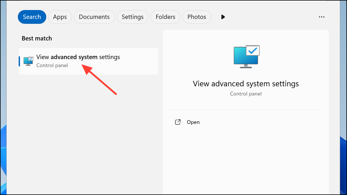 Step 2: Click the search icon on the Windows 11 taskbar, type advanced system settings, and select it from the results.