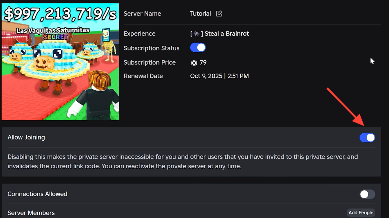 You know the private server works when your console account loads into an empty instance of Steal a Brainrot with no other players present. The server name you created appears in the server list on your secondary account.
