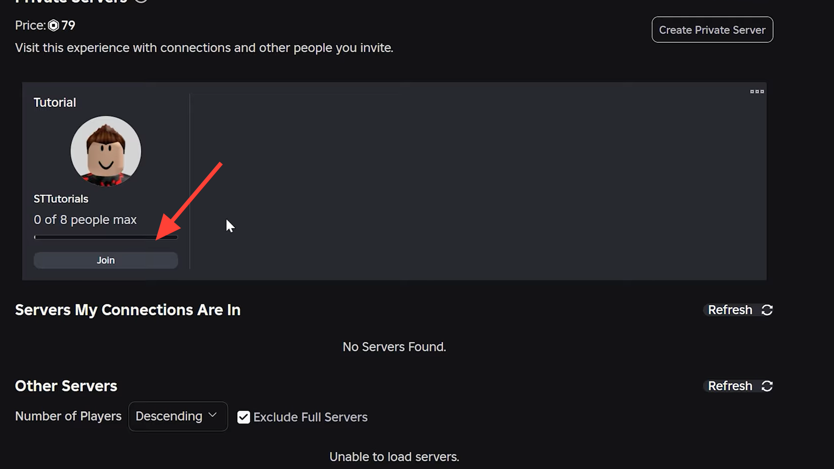 Step 2: Scroll down to the Servers section near the bottom of the game page. Tap or click Servers to open the server browser.