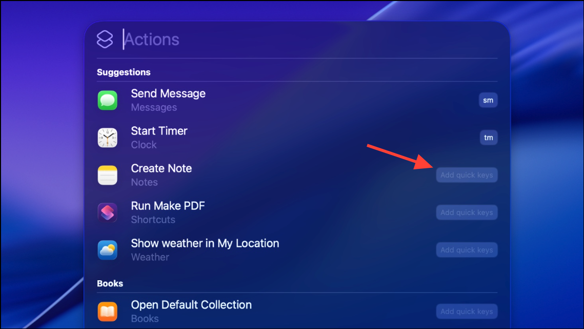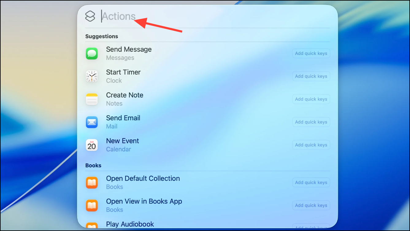 Spotlight’s new capabilities in macOS 26 include support for Quick Keys—short, memorable character strings that trigger frequent actions. Unlike conventional keyboard shortcuts, Quick Keys let you type a code like sm to send a message or ar to add a reminder, all from within Spotlight.