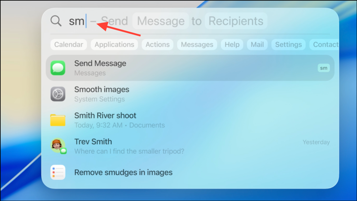 Step 3: Type an existing Quick Key, such as sm for "Send Message," and press Return. Spotlight will prompt you for any required details (like the message content or recipient) in a form, allowing you to complete the action without leaving Spotlight or opening the full app.