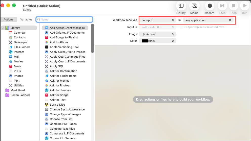 Step 2: Set the workflow to receive "no input" in "any application." This ensures your shortcut is available system-wide.