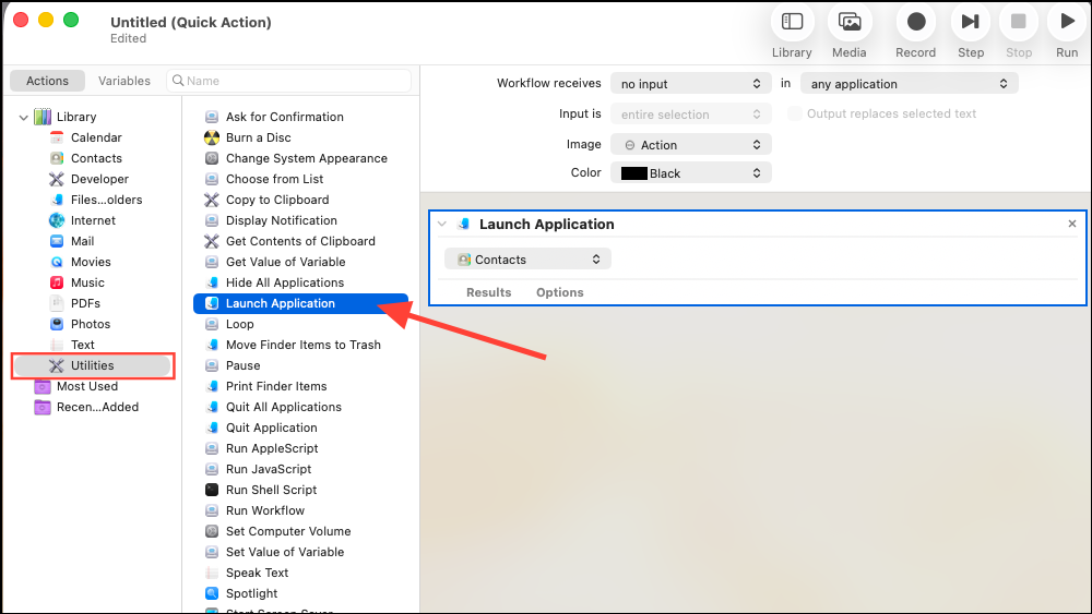 Step 3: Drag the "Launch Application" action from the Utilities library into your workflow. Select the application you want to launch (e.g., Terminal, Finder, or any other app).