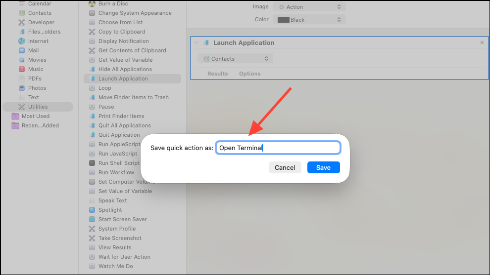 Step 4: Save the Quick Action with a descriptive name like "Open Terminal."