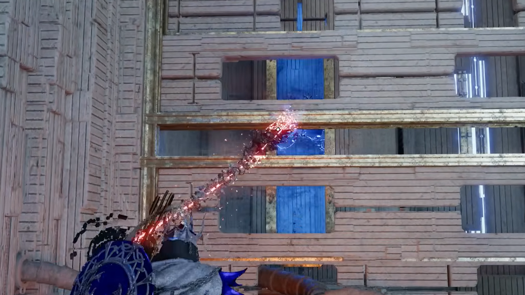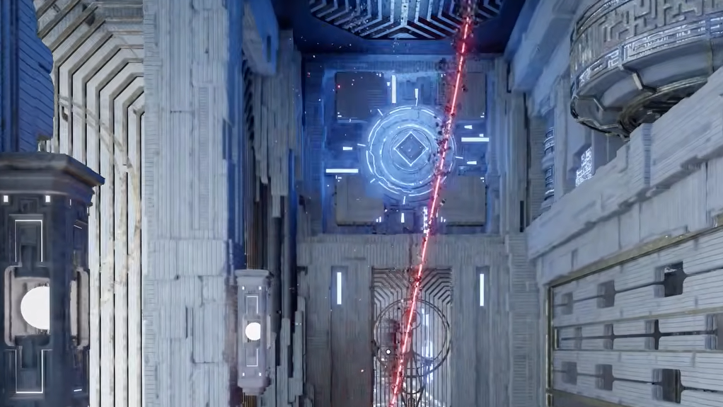 Step 4: Use Axiom Force through one of the wall openings to grab the plate. Guide it along the channel behind the wall, rotating it as needed, until it reaches the large opening near the entrance side of the lower hall.