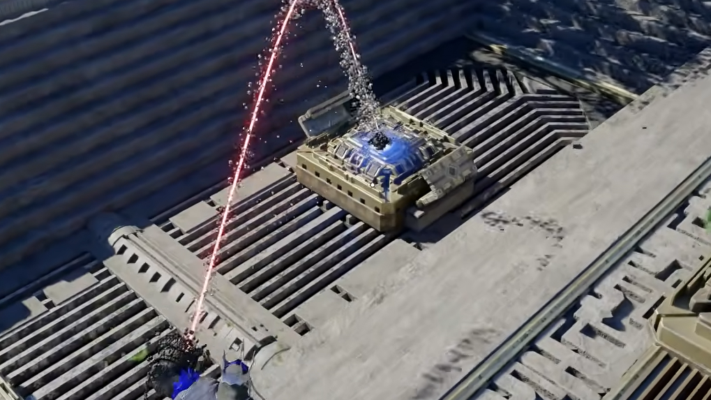 Step 2: Now grab the blue energy cube with Axiom Force and move it into the stone cube with a hole in it near the entrance. This powers the left-hand platform and causes the entire platform to flip over. Jump down into the gap before it closes to reach the lower level.