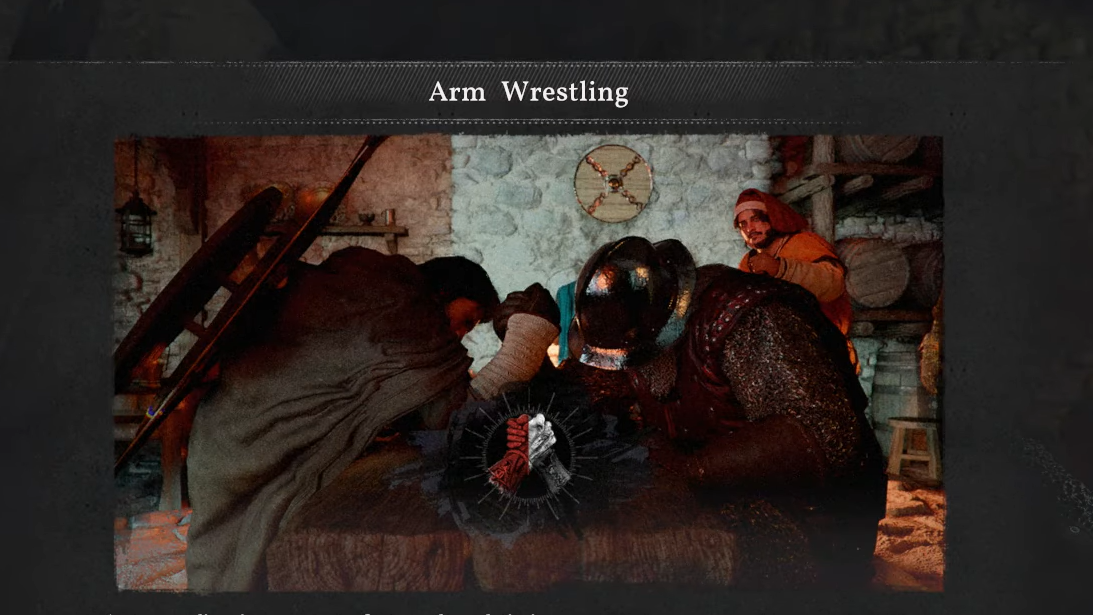 Step 1: Approach the arm wrestling host inside a tavern and interact with them. You'll need to put up a stake of in-game money before the match begins. Winning doubles that stake; losing forfeits it.