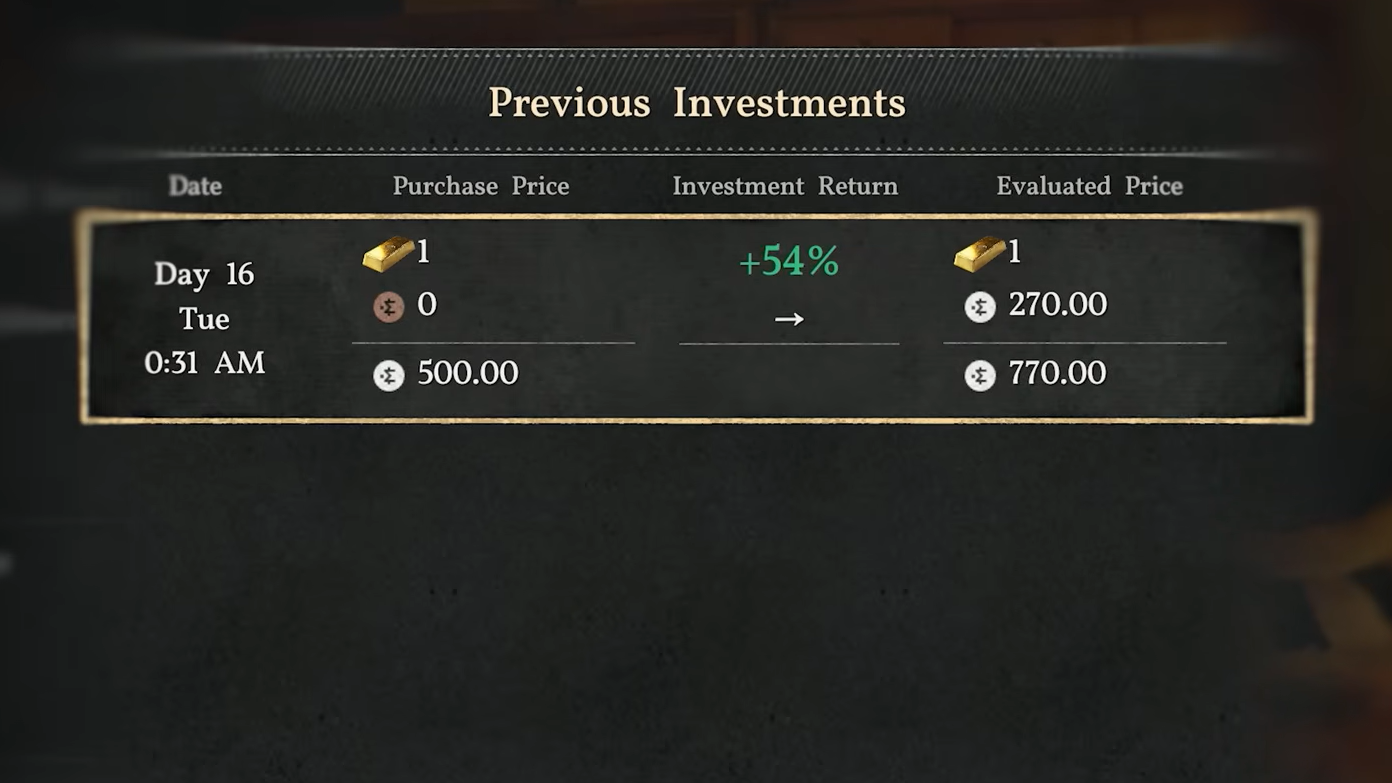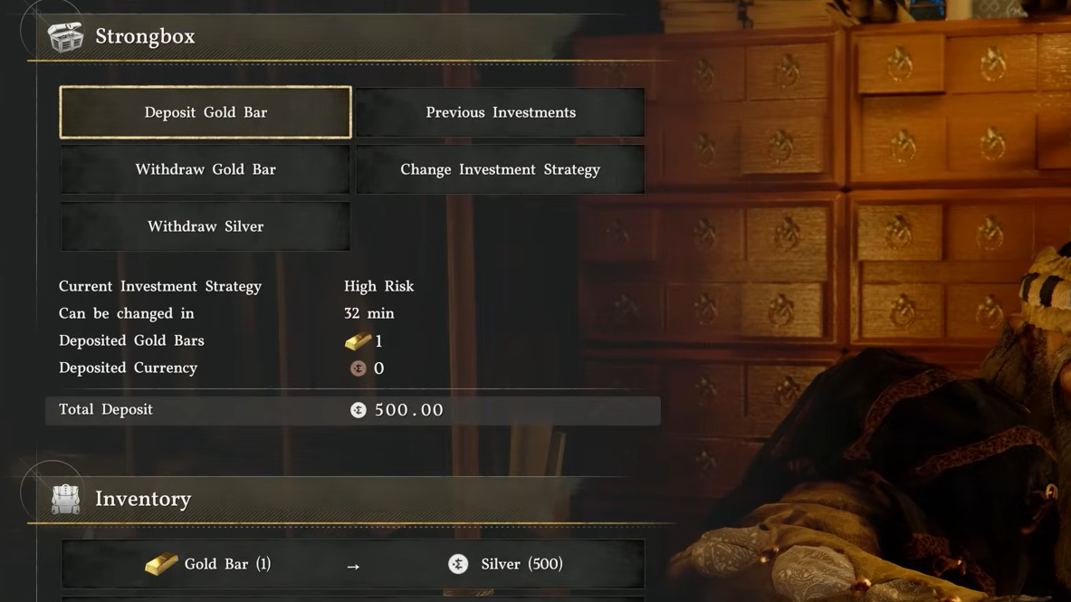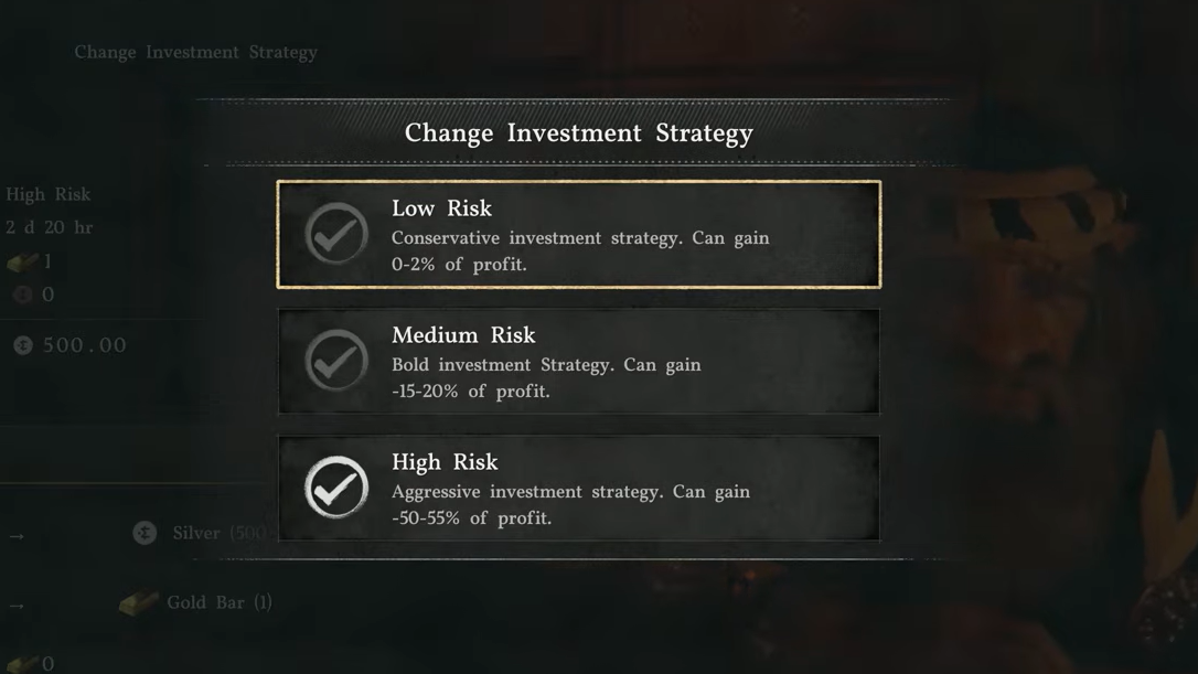 Once your Gold Bar is deposited, you choose one of three investment strategies. Each carries a different risk-reward profile, and you can switch between them every 15 in-game days.