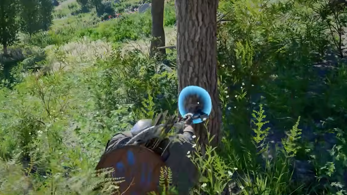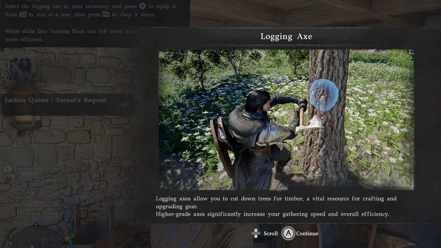 Step 2: Speak with Turnali and listen to his request. He needs wood to repair his hammer and gives you a Logging Axe. Head outside town, equip the axe via Quick Slot 2 (left D-Pad on controller, F2 on PC), and chop a tree. Aim with L2 / CTRL to see a blue targeting circle, then strike until the tree falls. Chop the fallen log into segments and collect three Fine Timber.
