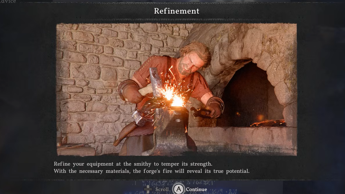 Interacting with any blacksmith and choosing Refinement opens a menu showing your currently equipped gear. Select a piece to see exactly which materials and quantities are required for the next upgrade tier. If you have everything, confirm to start the process. A short cutscene plays, and the item's stats increase immediately.